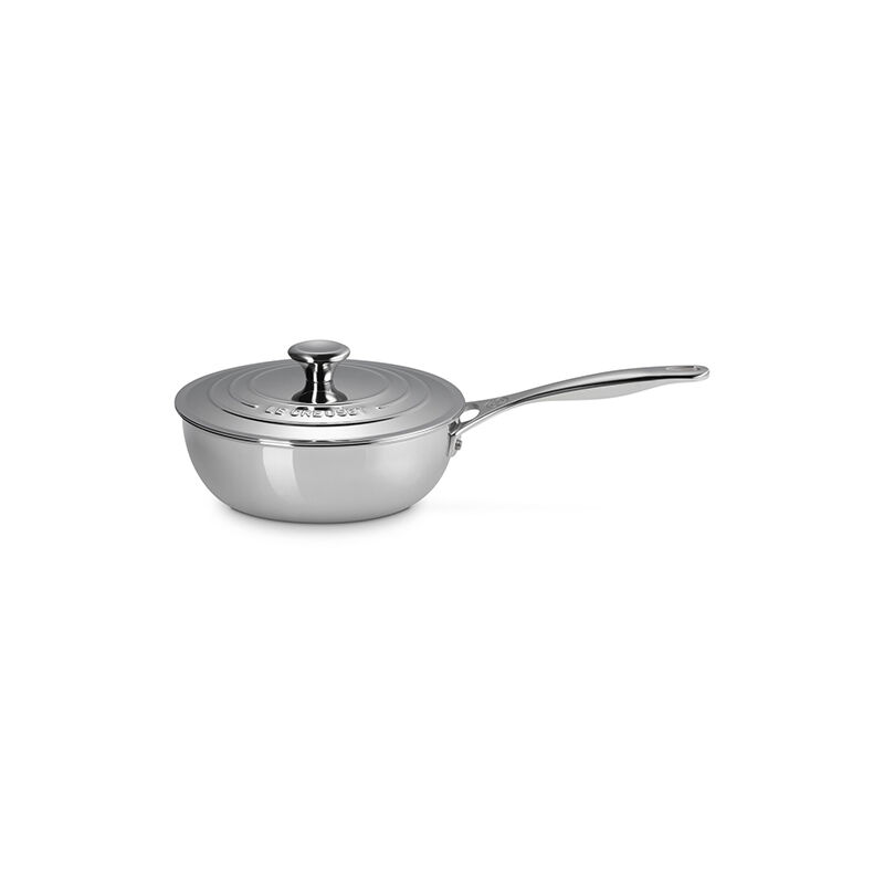 A chef’s favorite, the Signature Stainless Steel Saucier has a smooth contoured interior that is optimal for making sauces, risotto or saut¨¦ing vegetables. Sloping sides and a rounded bottom facilitate stirring and whisking, and also make cleanup easier than ever. Radiant and durable, the triple layer construction features a full base-to-rim aluminum core for superior heat distribution, while the lightweight titanium-infused stainless steel exterior resists scorching and corrosion at higher temperatures. Innovative details such as interior capacity markings, iconic three-ring lid with built-in steam vents, and a dripless pouring rim save valuable prep time and make cleanup a breeze.