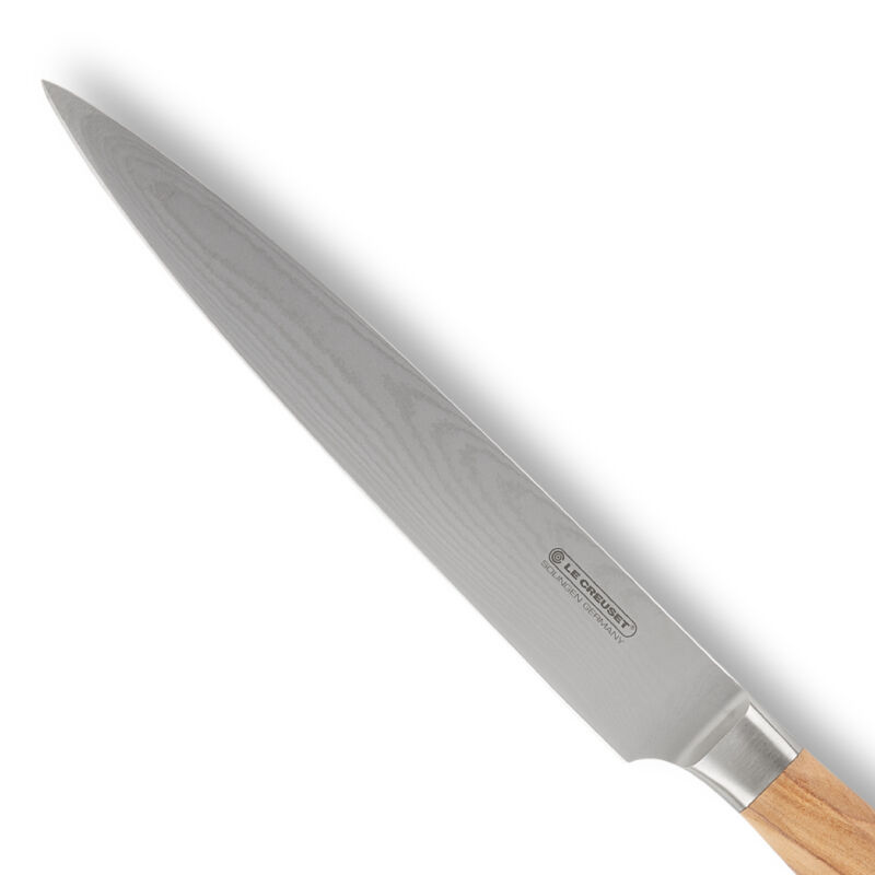 The Le Creuset Slicing Knife has a long thin 8″ blade for delicately carving or slicing meat, poultry or fish without tearing. Crafted with a beautiful and durable Italian olive wood handle, the slicing knife features 64 layers of Damascus steel folded around a VG-10 steel core. Forged in Solingen, Germany with a Rockwell hardness of 61, the knives hold a finely sharp edge and perform any kitchen task with ease.