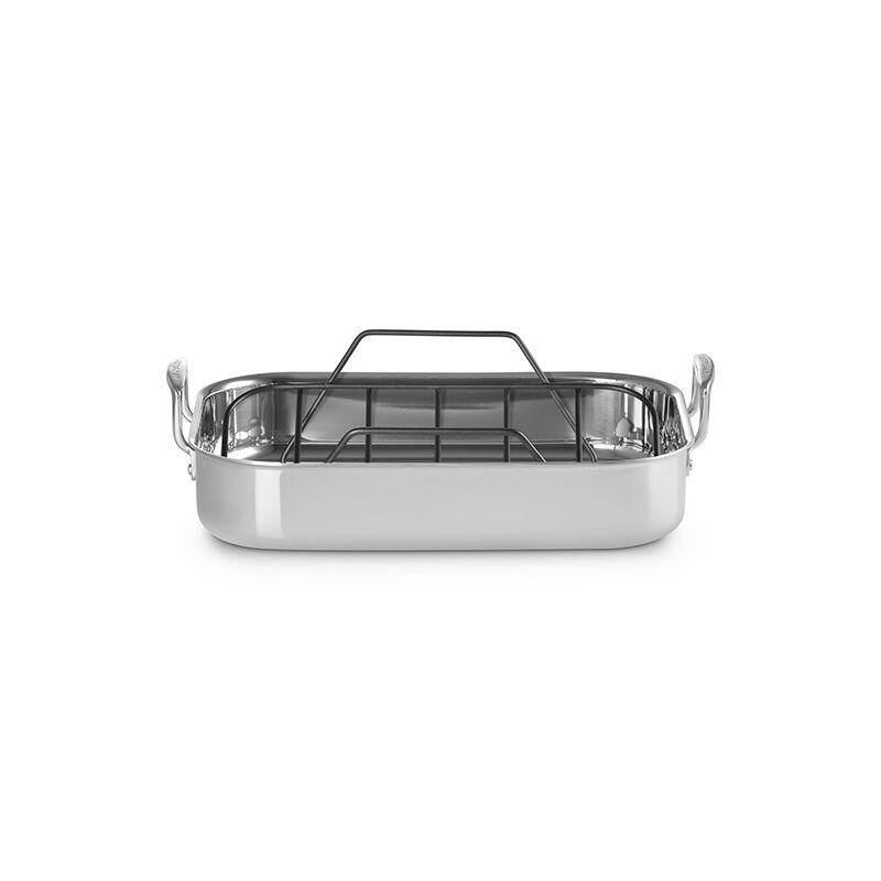 The Stainless Steel Roaster is ideal for roasting meats and vegetables, baking casseroles and desserts, and making pan gravy on the stove. Expertly constructed for long-lasting durability, the thick non-reactive stainless steel will not warp and is dishwasher-safe. The roaster has a dripless pouring rim to minimize spills, and comes with a non-stick rack to promote air circulation, even heating, and a golden brown crust.