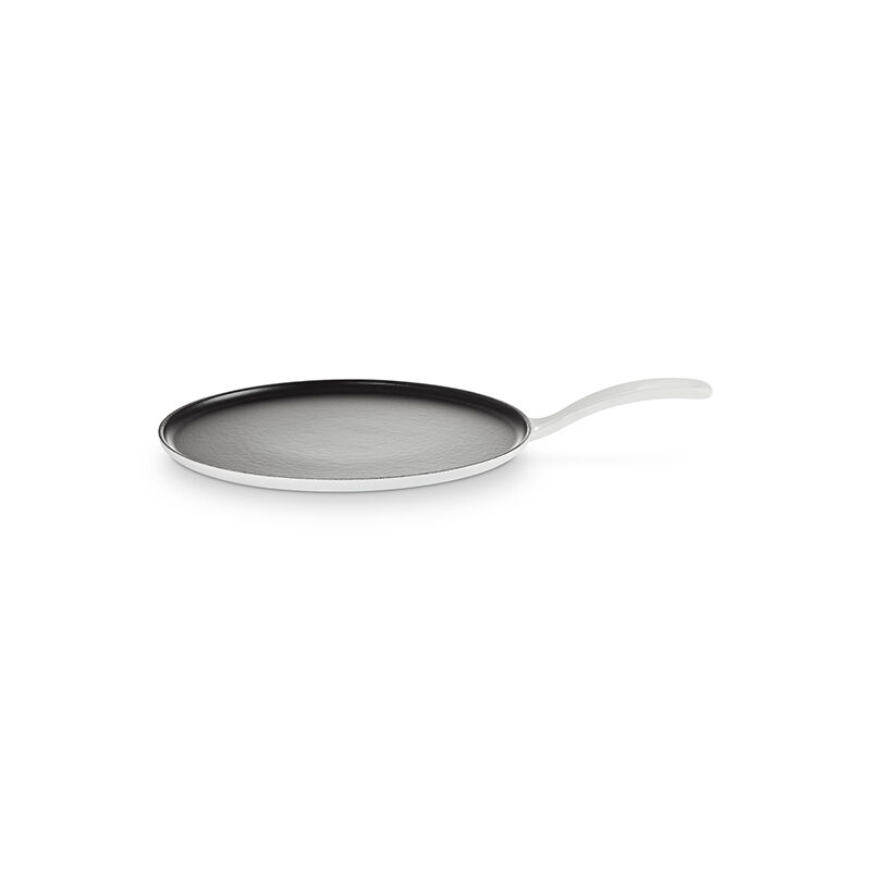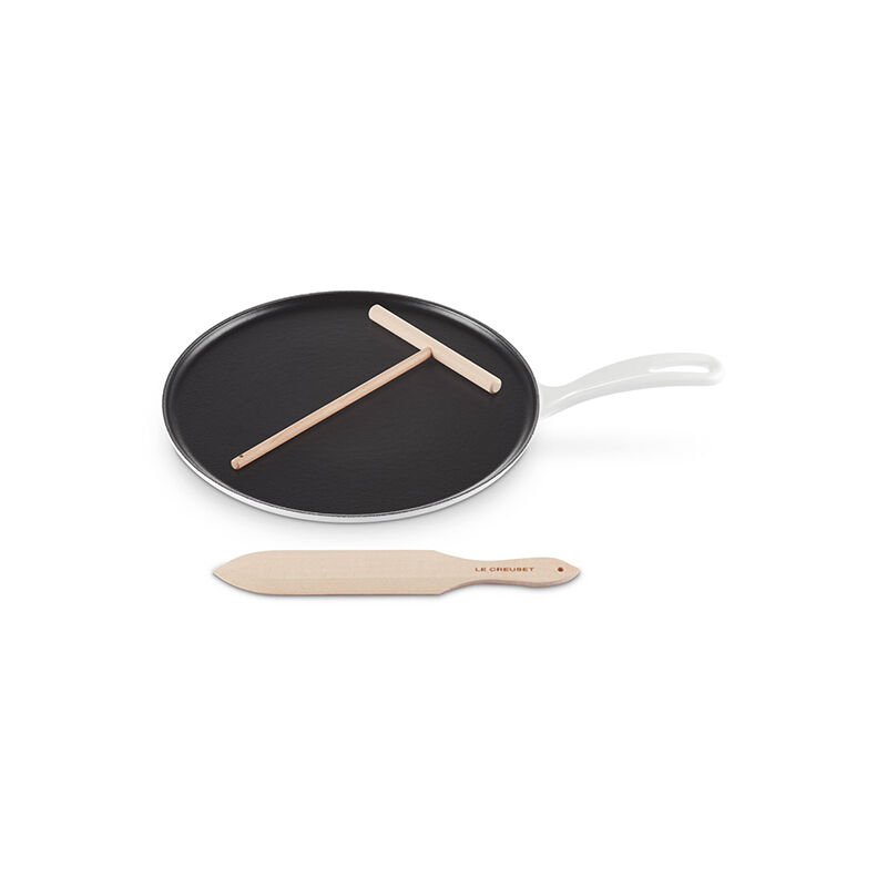 The enameled cast iron Traditional Crepe Pan features a low profile and gently sloping sides, making it perfect for creating delicate French crepes¡ªas well as flipping pancakes, hash browns and fritters with ease. Its smooth black satin enamel surface heats evenly and requires no seasoning, while the circular shape helps batter spread thinly and consistently. Use the included T-shaped rateau (rake) to distribute the batter in a smooth, circular motion, and the thin spatula to flip with precision. Fill, fold, and enjoy!