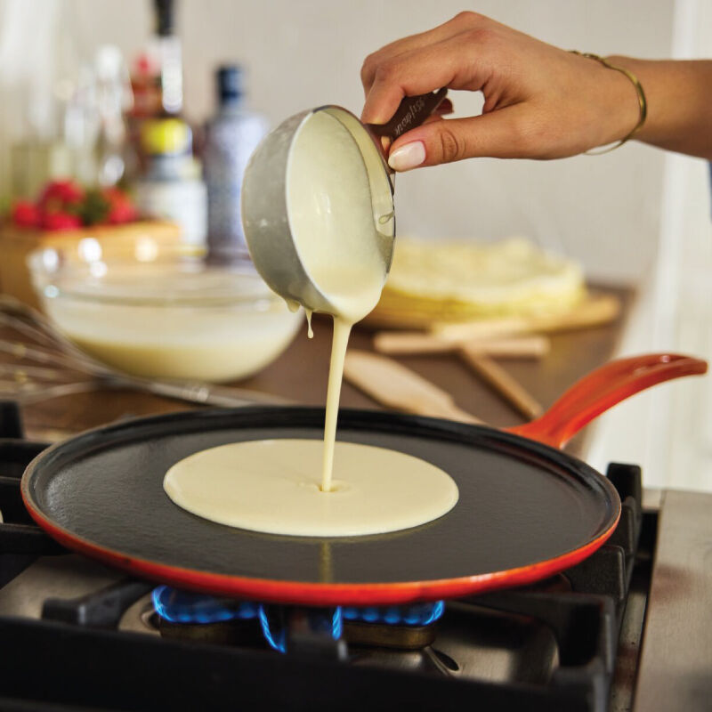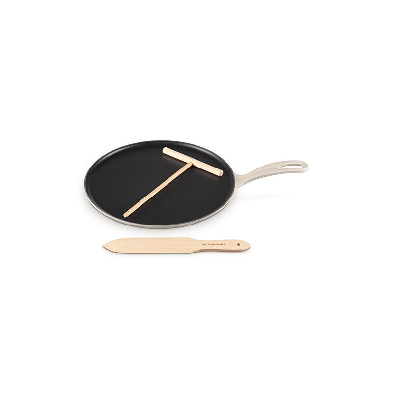 The enameled cast iron Traditional Crepe Pan features a low profile and gently sloping sides, making it perfect for creating delicate French crepes¡ªas well as flipping pancakes, hash browns and fritters with ease. Its smooth black satin enamel surface heats evenly and requires no seasoning, while the circular shape helps batter spread thinly and consistently. Use the included T-shaped rateau (rake) to distribute the batter in a smooth, circular motion, and the thin spatula to flip with precision. Fill, fold, and enjoy!